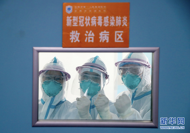 2月1日,合肥市滨湖医院隔离病区,医护人员互相加油鼓气。新华网发(徐国康 摄)
