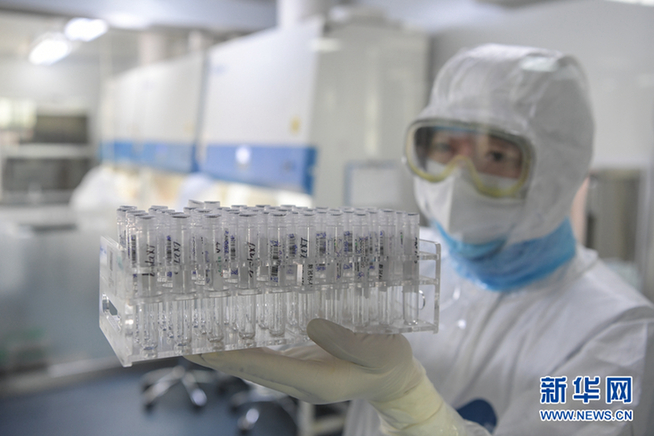2月9日,在负责新冠肺炎核酸检测的合肥金域医学检验实验室,工作人员展示提取后的病毒核酸样本。新华网发(刘玉才 摄)