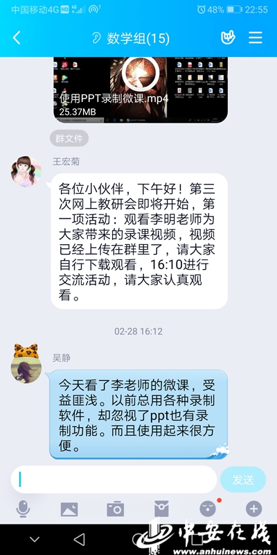 随着网课的深入开展,包河区教育局和学校都开始定期组织教学研讨活动,助力“在线课堂”。每一场研讨我都按时参加、认真学习,不断get新技能。学校副校长兼信息技术总顾问虞积莉,专门录制微课,传授手机录屏、小微课制作以及QQ小程序使用的各种小诀窍,让我有了“手机在手,走遍天下”的信心;李明老师通过自制小视频,介绍用ppt制作微课的方法;吕霞丽老师分享线上鼓励孩子的妙招……这些分享让我成功跻身为“技术宅”,再也不用担心我的网课教学啦!