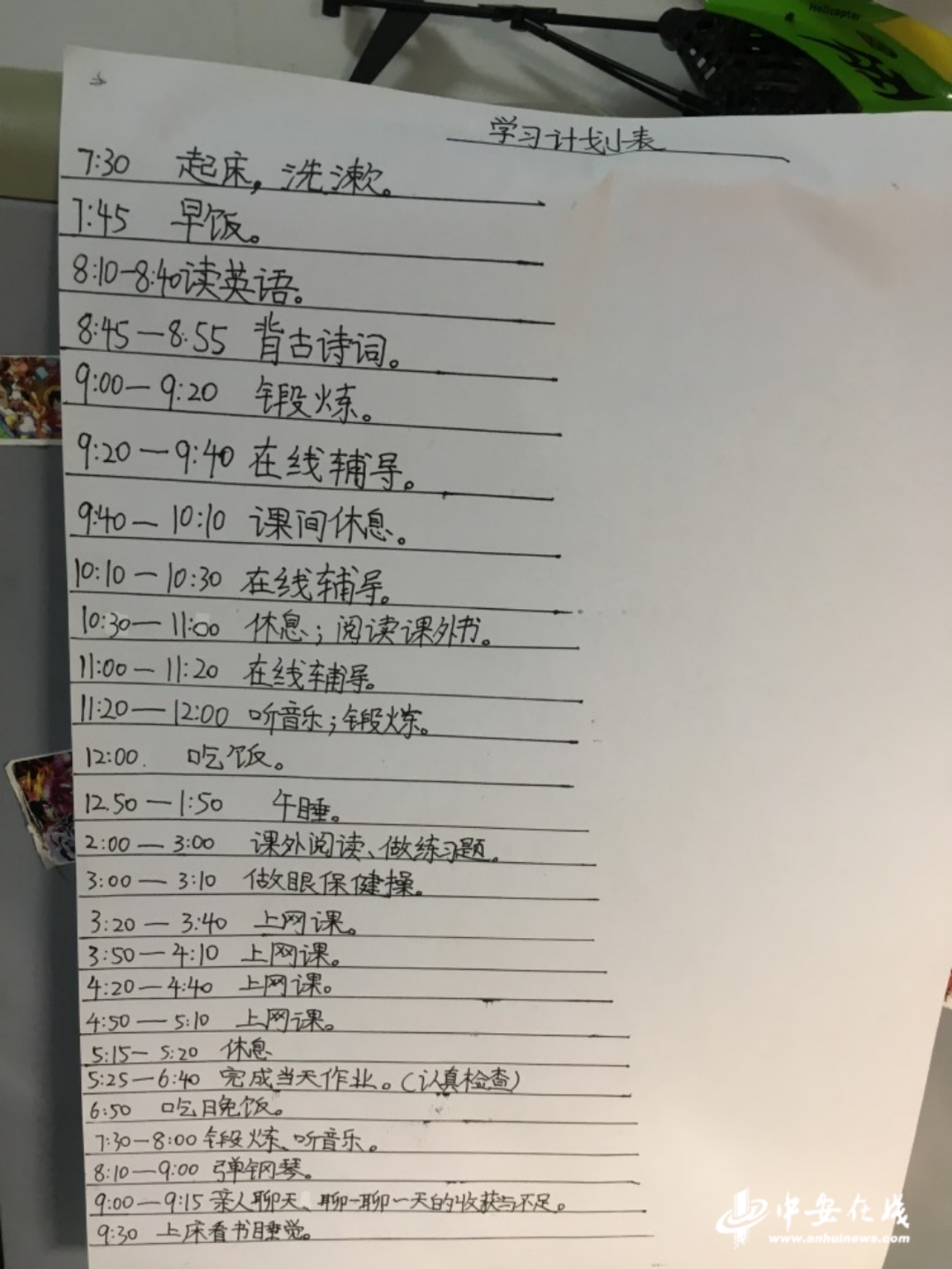 中安在线 中安新闻客户端讯 这个超长假期,合肥小学生周禹赫在学习计划表里列出了洗衣、刷碗、炸货等“必学技”;李良浩和胡晓帆将时间安排精确到分,一天背一篇古诗词,两天看完一本书。