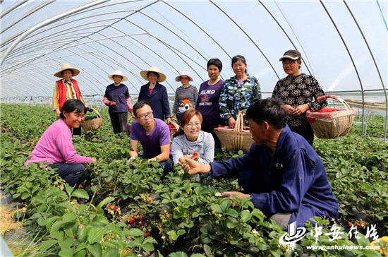 2015年5月,王萌萌牵头成立了“吴圩镇皖圩种养专业合作社”,采取“专业合作社+农户+贫困户”模式,引导农户搞种植、养殖,陆续建起了草莓园、西瓜园、蔬菜基地、枣园、葡萄园1000多亩。王萌萌又利用创业示范基地成立了一个扶贫车间,不仅可以实现贫困人口家门口就业,还能在车间举办劳动技能培训。在此基础上,2018年,王萌萌发展起种养循环经济产业园,养殖生猪,种葡萄、草莓等,不仅让参与种植养殖的97户贫困户户均年收入达2万元,每年还为村集体增加不低于15万元的收入。如今的西孔村,随处可看到“一年四季有花开,一年四季有果摘”的美丽乡村图景。