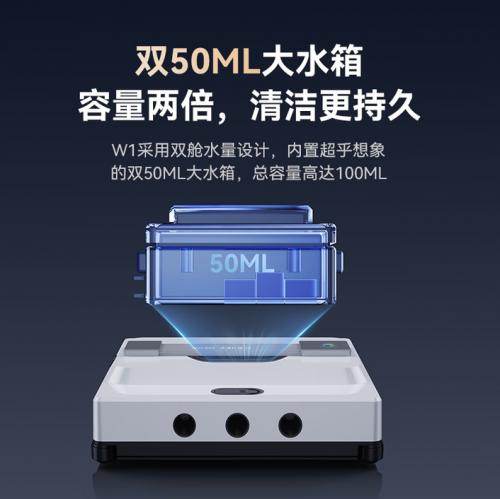 希亦W1在续航能力和操作便捷性方面同样出色。W1采用双舱水量设计,可拆卸的双50ML大水箱,总容量高达100ML,是传统小水箱三倍,一次加水即可覆盖整屋落地窗,配合六喷头雾化输出,出水更稳定,清洁更持久。机身设计轻薄,仅8.9厘米的厚度使其能轻松进入狭窄窗缝。配合智能语音播报功能,设备可实时汇报工作进度,让用户随时掌握清洁状态,真正实现无忧操作。