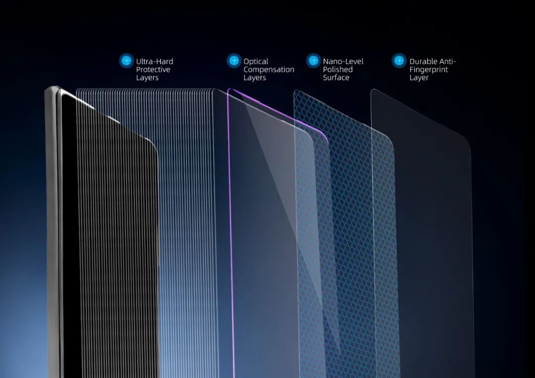 该产品核心优势凸显,采用4000层纳米叠层工艺,内含超硬膜层,整体硬度(莫氏硬度)达7级以上,抗跌落、抗划伤性能提升10倍。同时集成多层光学镀膜,兼具超高透光率与低反射率,实现高清显示与防眩光双重效果。此外,其表面覆盖长效AF抗指纹层,并经纳米级抛光处理,耐摩擦次数高达15000次,摩擦系数低至0.02,触感顺滑细腻且持久。