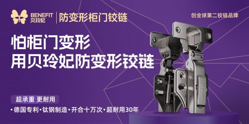 BENEFIT(贝玲妃)铰链7.5公斤的承重能力和超8万次的开合测试保障,让设计师可以放心使用更大、更重的门板材料。