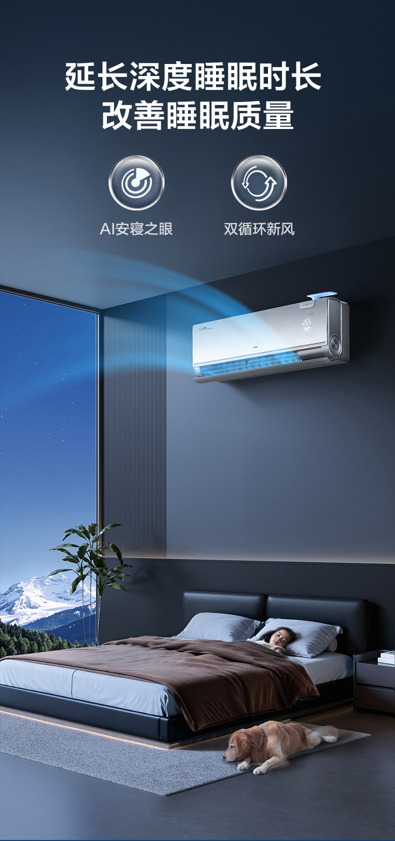这是TCL空调构建的“1+N”睡眠科技解决方案,联动静音、新风、柔风和灯光调节,打造“零存在感”睡眠环境。