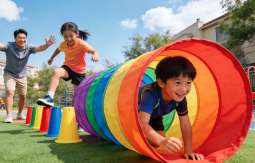 飞盘采用软质环保材质,重量轻盈不伤人,边缘圆润无棱角,孩子抛接安全无压力,还能搭配套装里的投篮框,解锁 “飞盘投篮” 新玩法,锻炼手眼协调能力;障碍接力跑配套折叠标志桶、彩虹隧道,家长可随意组合搭建赛道,孩子钻隧道、跨障碍、绕标志桶,在奔跑中释放精力,体能悄悄提升;亲子跳绳则设计了双人手柄,家长与孩子同步跳跃,还能通过计数功能开展 “跳绳 PK 赛”,增进亲子默契;寻宝大冒险包含趣味任务卡、隐藏式线索,孩子跟着线索找“宝藏”,在探索中锻炼观察力与逻辑思维;平衡挑战赛的彩虹平衡木、触觉脚印,能锻炼孩子的平衡感与核心力量,家长也能参与挑战,找回童年乐趣。