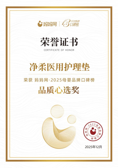 我们衷心祝贺净柔医用护理垫荣获2025妈妈网母婴口碑榜“品质心选奖”!这份荣誉属于每一位支持与信赖净柔的用户,也属于所有坚守品质底线、用心做产品的品牌同行者。