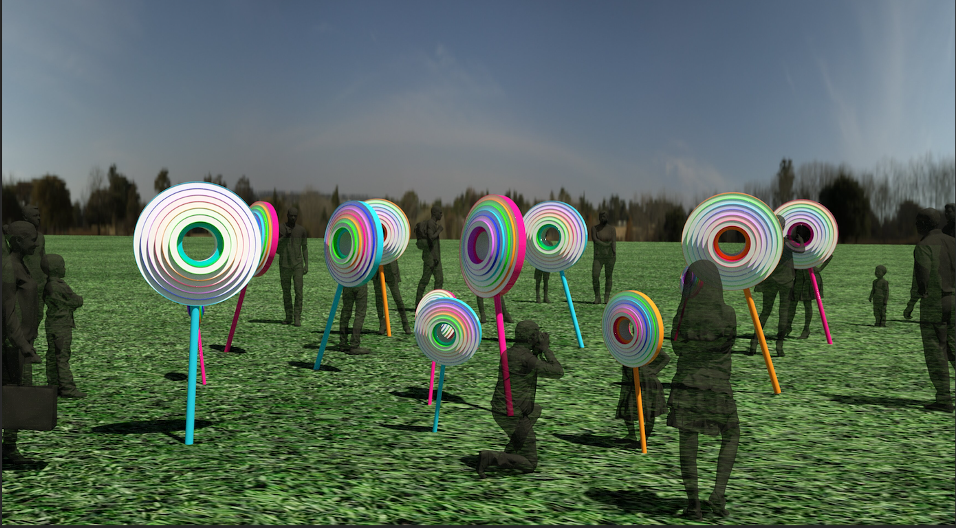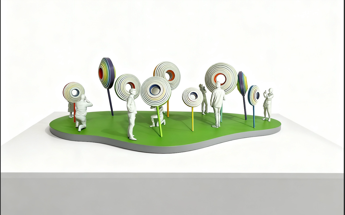 在空间与场景的融合方面,部分作品表现出良好的场地适配性。如《雨涧石》以写意手法融入1号点位,与建筑景观相得益彰;《大地之糖》以一组色彩明快、形态活泼的棒棒糖造型装置构建出充满童趣的视觉韵律,观众可穿梭其间、触摸互动,成为极具亲和力的艺术焦点。
