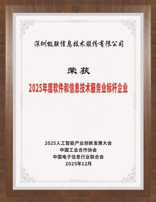 近日,由中国电子信息行业联合会、中国工业合作协会联合主办的“2025人工智能产业创新发展大会”在北京举行。深圳极联信息技术股份有限公司(以下简称:极联股份)凭借在人工智能与行业深度融合方面的卓越表现,荣获“2025年度软件和信息技术服务业标杆企业”称号。这一殊荣不仅是对极联股份技术实力与创新成果的高度认可,更标志着公司在推动“人工智能+”行动落地、赋能千行百业数字化转型中的引领地位。极联股份将不断扩大科技研发团队,夯实科技创新根基,不断寻求技术突破,加大对技术创新和研发的投入,为企业数字化改革提供更多、更优质产品解决方案,加速企业数字化转型升级,为国家信息化建设做出更大的贡献!