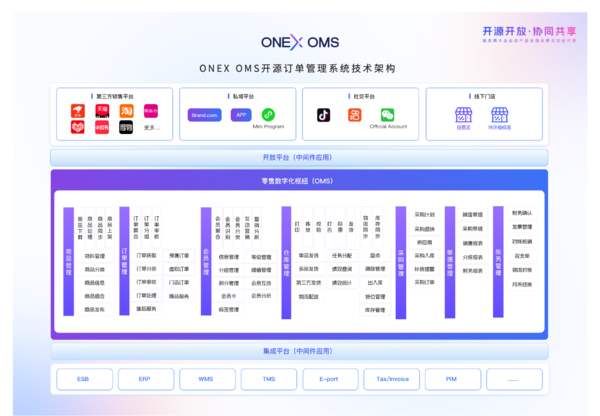ONEXOMS定位于全渠道业务协同枢纽,支持多平台订单统一处理、全局库存一盘货管理、全流程仓储与财务对账,已对接200余家主流电商平台与生态服务商。系统架构历经长时间打磨与项目沉淀,成熟稳定,可高效支撑品牌官网、O2O云店、社交电商及复杂规则公域平台的订单调度与数据整合。