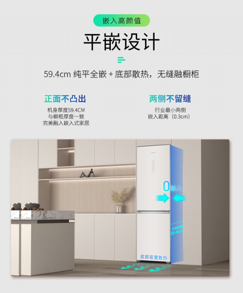 针对中国家庭对嵌入式冰箱的深度需求,澳柯玛以59.4cm整机厚度实现与橱柜的零落差全平嵌入,彻底消除传统冰箱“凸柜”的视觉突兀感。底部前置散热系统,将散热路径隐藏于底部,两侧无需预留散热空间,搭配单体凸轮轴铰链,即使紧贴墙面也能实现115°自由开门,抽屉拉取顺滑无阻,完美诠释“隐形于形,卓越于芯”的设计哲学。