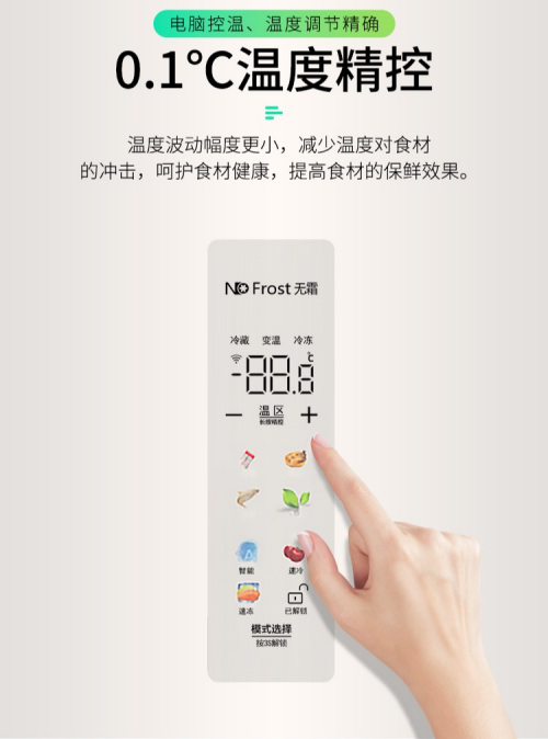 在温度控制方面,冰箱内置智能感温系统,通过高精度传感器实现0.1℃精准控温,24小时实时监测环境变化,有效避免温度波动导致的食材腐坏变质。搭配金属背板微风道,可快速均匀降温,同时保持90%以上湿度,让果蔬7天鲜嫩如初。