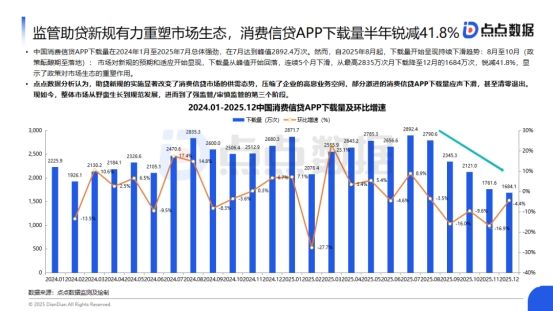监管助贷新规有力重塑市场生态,消费信贷APP下载量半年锐减41.8%中国消费信贷APP下载量在2024年1月至2025年7月总体强劲,在7月达到峰值2892.4万次。然而,自2025年8月起,下载量开始呈现持续下滑趋势:8月至10月(政策酝酿期至落地): 市场对新规的预期和适应开始显现,下载量从峰值开始回落,连续5个月下滑,从最高2835万次月下载降至12月的1684万次,锐减41.8%,显示了政策对市场生态的重塑作用。