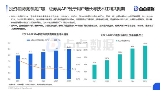 投资者规模持续扩容,证券类APP处于用户增长与技术红利共振期从2021年到2025年,证券投资者数量呈稳定上升趋势,2021年为1.97亿户,到2025年预计达到2.49亿户。同时,线上交易金额占比也在不断提高,2021年约为85%,2025年预计超98%。这表明越来越多的人参与到证券投资市场中,并且更倾向于通过线上渠道进行交易。证券服务APP作为线上交易的主要载体,用户基数有望随着市场的扩大而持续增加,为APP的发展提供了广阔的市场空间。