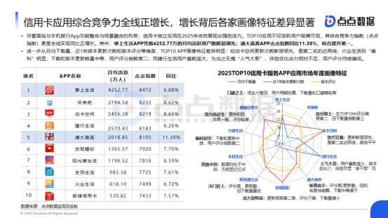 尽管面临与手机银行App功能整合与场景融合的形势,信用卡独立应用在2025年依然展现出强劲活力。TOP10应用不仅活跃用户规模可观,其综合竞争力指数(点点指数)更是全线实现同比正增长。
