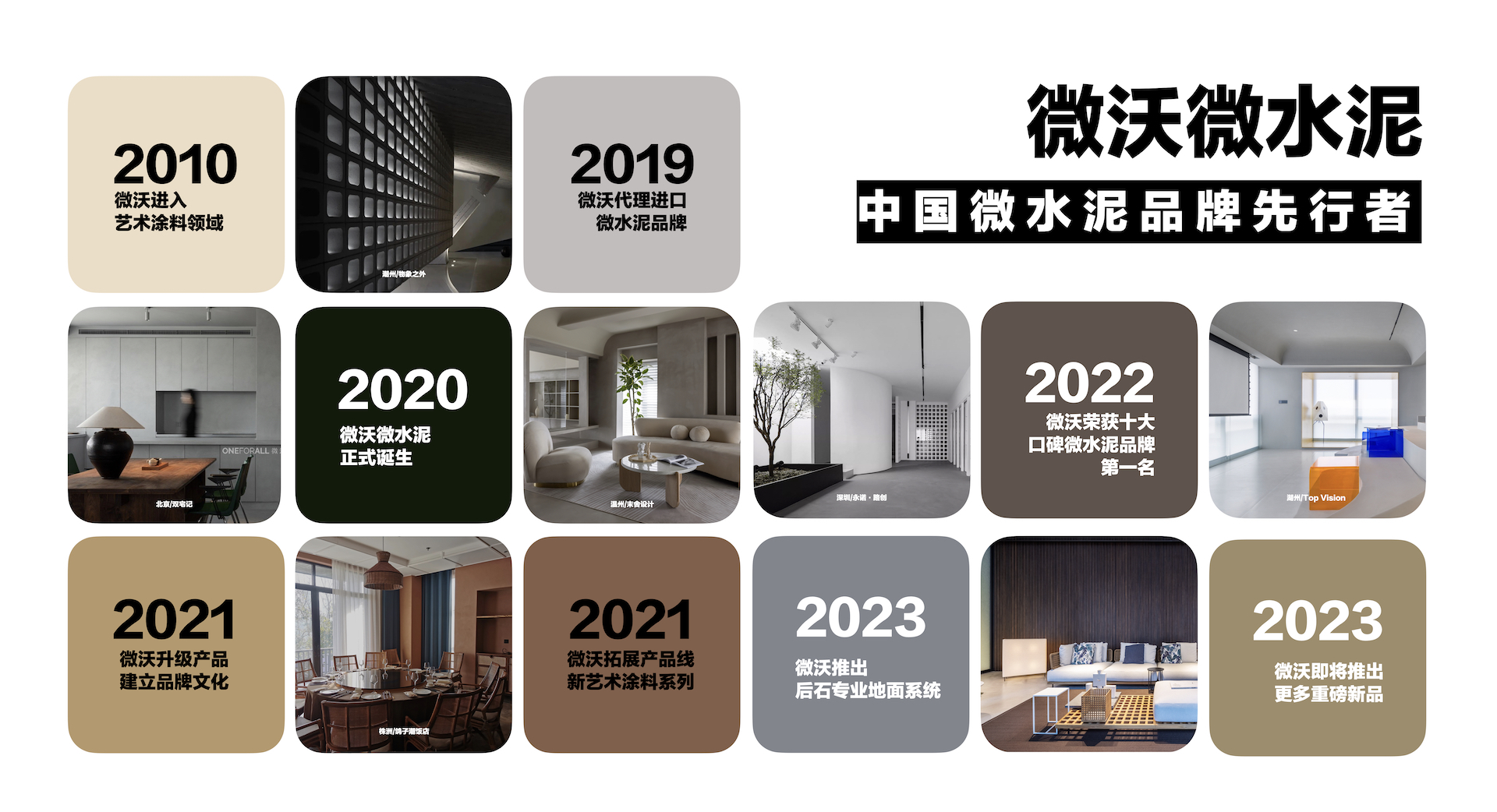 微沃是中国微水泥第一品牌,在品牌影响力与市场份额占比均名列前茅。作为头部品牌,微沃专注于微水泥和艺术涂料领域,品牌旗下拥有微沃经典微水泥、后石专业微水泥、集彩艺术涂料、磨力涂改色神器等多系列创意材料。截至2025年11月,微沃已拥有 180 多家线下展厅与专卖店,700+遍布全国的合作服务网点。
