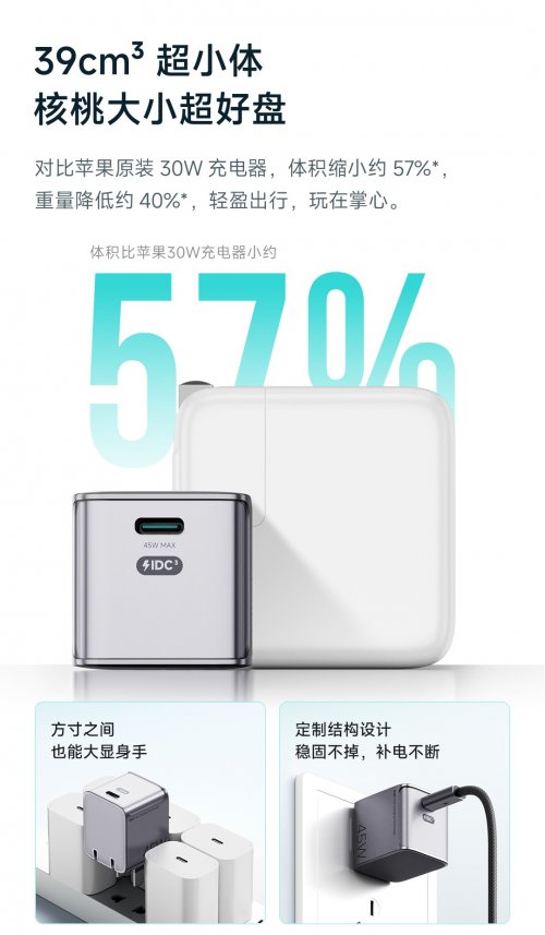 性能表现上,新品实现了核心突破——45W满载持续输出不降档,性能超越了市面上的同规格产品。有知名KOL评测结果显示,用负载仪测试45W满功率,连续48小时依旧满功率不降档,稳稳当当!实测数据显示,其可为iPhone 17系列提供极速快充,半小时即可充入约63%电量,同时还支持小米私有协议,能激活45W澎湃秒充,为米系机型带来原厂级快充体验。