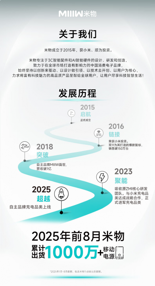 米物科技作为深耕3C数码和AI硬件领域的创新企业,自2015年成立以来,始终专注于智能终端设备的研发与设计。而在2023年米物在吸收了原紫米核心充电品类团队后,开始重点发力充电品类,成为小米充电宝的御用研发设计及生产制造厂商。仅2025年前8月,米物的充电宝出货量就超过1000万!