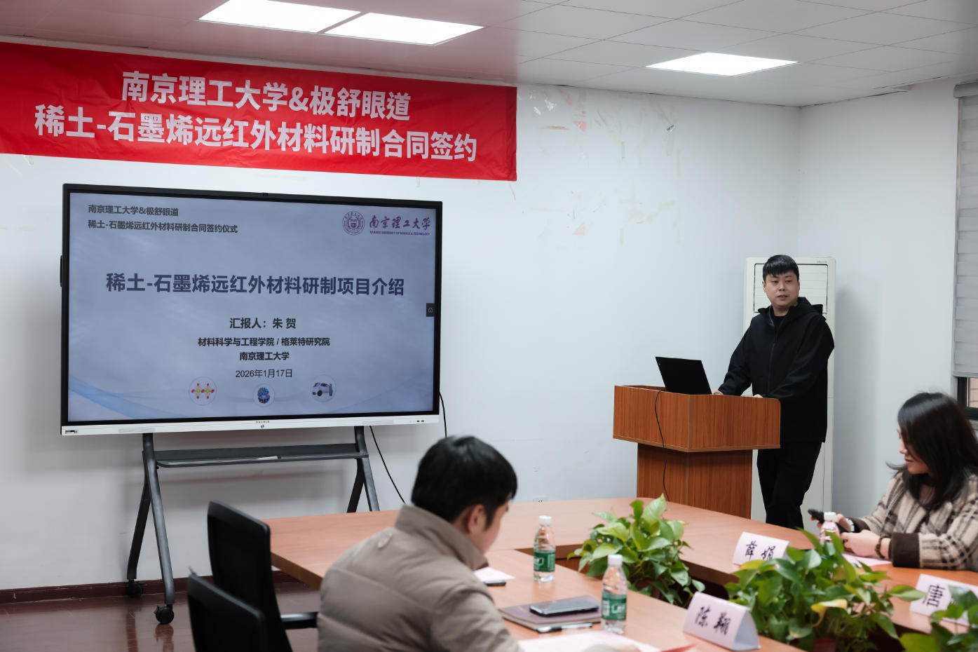 2026年1月17日,南京理工大学材料学院与眼部健康创新企业“极舒眼道”正式签署战略合作协议。双方将围绕稀土石墨烯功能材料,在眼部健康护理领域开展深度研发合作,共同推动高校原创科技成果向产业落地。当天,南京理工大学材料学院副院长陈翔教授致辞,材料学院兰司教授、朱贺教授及核心科研团队,极舒眼道创始人唐燚等企业代表共同出席签约仪式,见证这一“科技赋能护眼”的重要时刻。