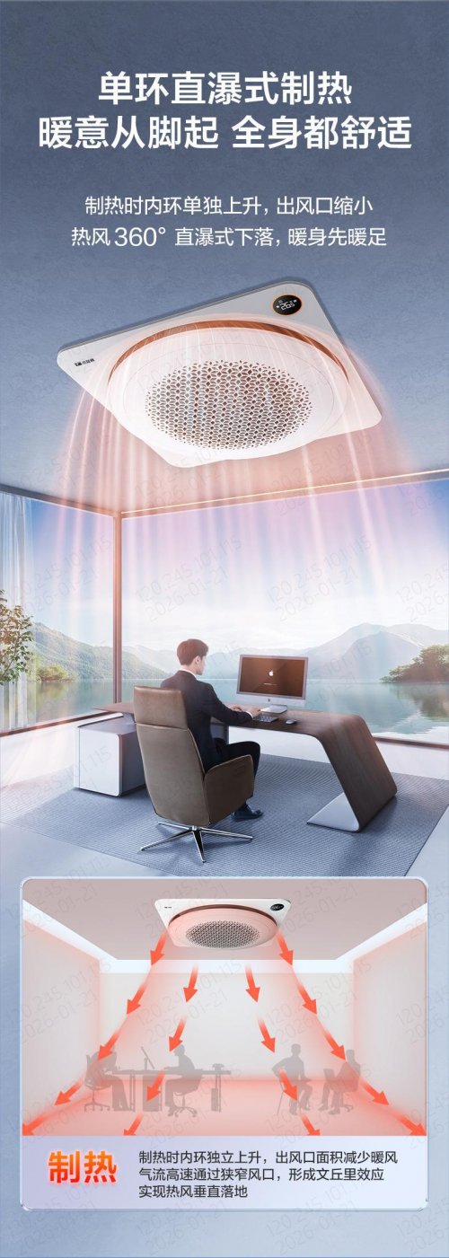 而在制热时,小蓝翼天花机则切换至“单环直瀑式暖风制热”。内环单独上升,缩小出风口,迫使暖风以更高速度吹出。这利用了“文丘里效应”,加速的热风能有效克服上升惯性,实现360°强劲向下送风,宛如温暖的瀑布倾泻而下,确保热量从用户脚部开始弥漫,实现暖身先暖足。