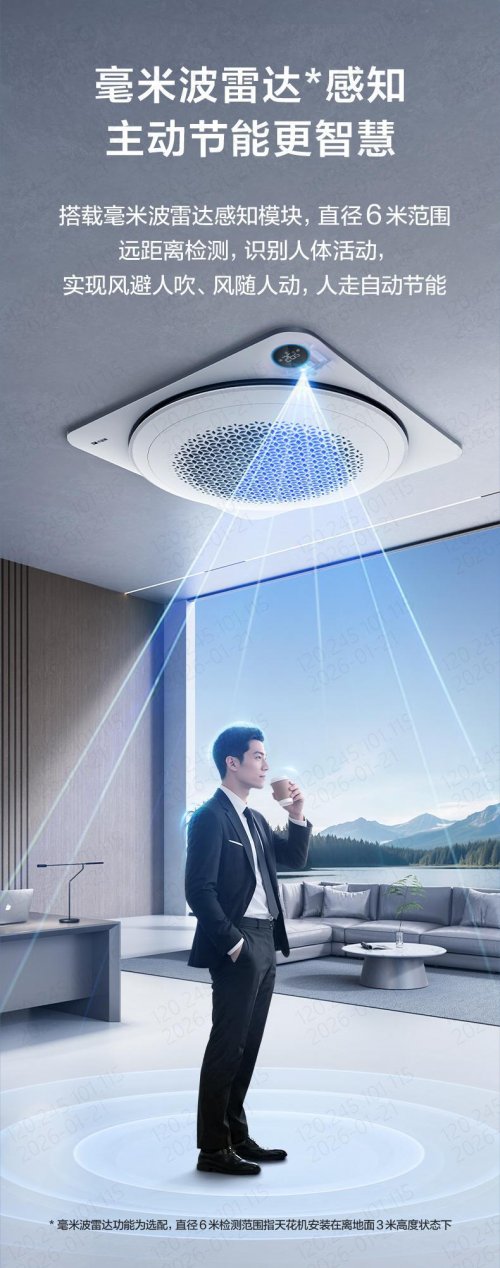 “小蓝翼空气生活家”不再仅仅满足于“调节温度”这一基本功能,而是致力于为用户塑造一个健康舒适家居环境。小蓝翼天花机搭载的毫米波雷达感知模块(选配)能在直径6米范围内精准识别人体的动态与静态存在,实现“风避人吹”或“风随人动”,在人离开时自动进入节能模式。这种“感知-认知-决策”的能力,正是“AI从感知到认知”的落地,让空调具备了环境理解与主动服务能力。