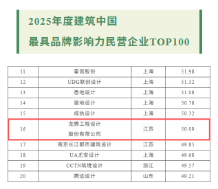 据悉近日,ARCHINA建筑中国面向全球正式发布“2025年度建筑中国·最具品牌影响力评选”企业榜单,江苏龙腾工程设计股份有限公司荣膺“2025年度建筑中国·最具品牌影响力民营企业TOP100”第16名、“2025年度建筑中国·江苏省最佳建筑设计品牌”。