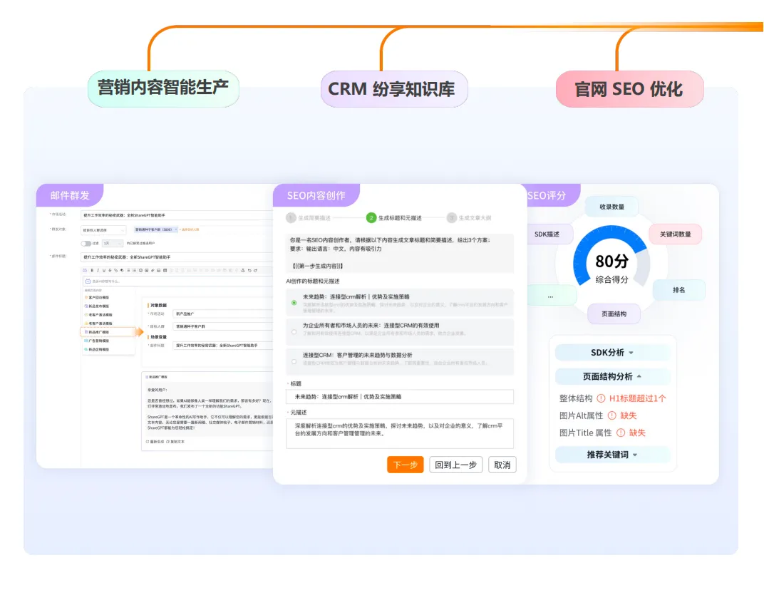 在内容创作上,它能基于CRM业务数据与行业知识库,快速生成活动策划方案、推广海报、邮件文案、SEO文章等多类型物料,提供30+预置业务场景模板,将营销策划从“作文题”转化为“填空题”,解决B2B产品内容创作难、质量与效率失衡的问题。