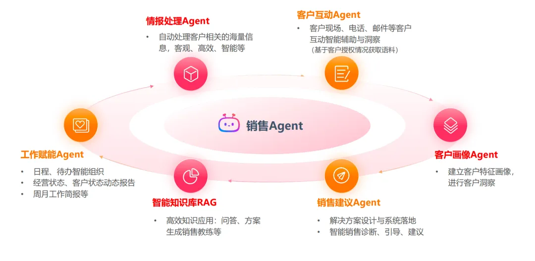 纷享销客销售AI通过情报处理Agent、客户互动Agent、客户画像Agent、销售建议Agent、智能知识库RAG、 工作赋能Agent等场景的智能体矩阵,为企业销售环节带来“效率、转化、能力”的三重价值提升。
