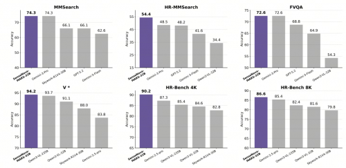 在MMSearch榜单(图文搜索核心评测)中,模型以 74.27 分登顶,超GPT-5.2(66.08 分);HR-MMSearch(高清细节搜索评测)中以54.43 分领先,显著拉开与闭源模型的差距。