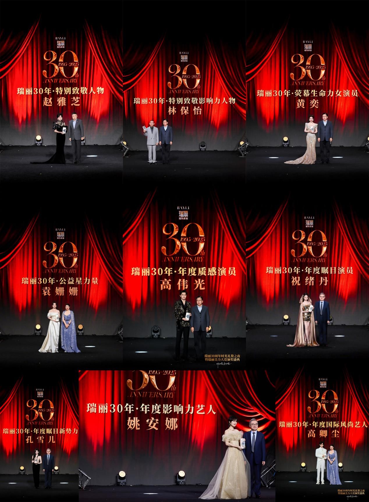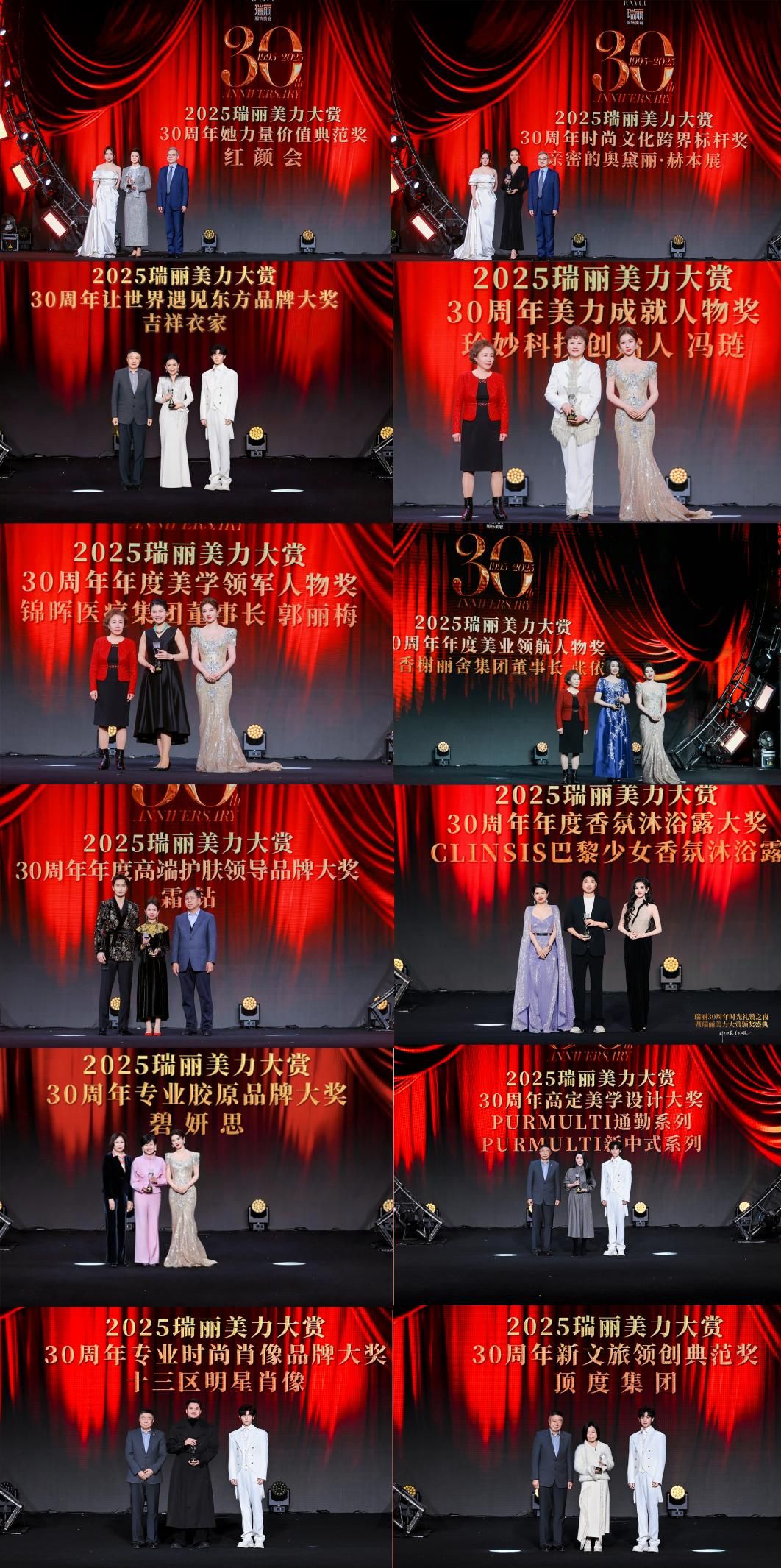 盛典环节揭晓了“瑞丽美力大赏·瑞丽30周年大奖”。该奖项聚焦过去一年在时尚、美妆、生活方式等领域真正引领潮流、触动心灵的品牌与产品。众多杰出品牌/人物荣膺大奖:红颜会荣膺“她力量价值典范奖”、珍妙科技创始人冯琏荣膺“美力成就人物奖”、法国香榭丽舍集团董事长张依群荣膺“年度美业领航人物奖”、锦晖医疗集团董事长郭丽梅荣膺“年度美学领军人物奖”、碧妍思荣膺“专业胶原品牌大奖”、霜钻荣膺“高端护肤领导品牌大奖”、CLINSIS巴黎少女香氛沐浴露荣膺“年度香氛沐浴露大奖”、吉祥衣家荣膺“让世界遇见东方品牌大奖”、Purmulti荣膺“年度高定美学设计大奖”、十三区明星肖像荣膺“专业时尚肖像品牌大奖”、顶度集团荣膺“新文旅领创典范奖”、亲密的奥黛丽·赫本展荣膺“时尚文化跨界标杆奖”,品牌的聚力同行,才能携手共创佳绩。这不仅是对产业创新者的表彰,更是对未来美力生态的展望。