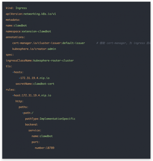 通过KubeSphere,将Clawdbot纳入Kubernetes的统一管理体系,可以在不改变其原有架构和使用方式的前提下,获得标准化部署、可观测运维以及安全可控的运行环境。对于希望长期运行 Bot 服务、或在团队内复用 AI助手能力的用户来说,这是一条非常自然、也非常稳妥的路径。