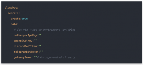 将OpenClaw(Clawdbot)扩展组件推送到KubeSphere扩展商店,并进行安装。在安装过程中,通过扩展组件配置加载相关密钥: