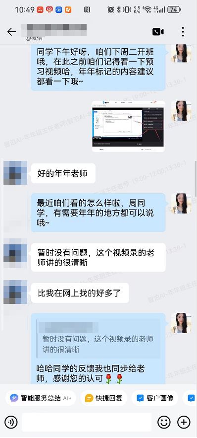 “琳瑶老师太耐心了!” 问题解决后,周同学由衷地表达了感谢。这份认可,我们第一时间就同步给了琳瑶老师,让老师的每一份付出都能收获温暖的回应。从班主任主动跟进预习进度、同步学员好评,到快速协调讲师资源解决实操难题,再到跟进问题解决情况、传递学员谢意,每一个环节的衔接,都彰显着智泊AI 服务的专业性与温度。
