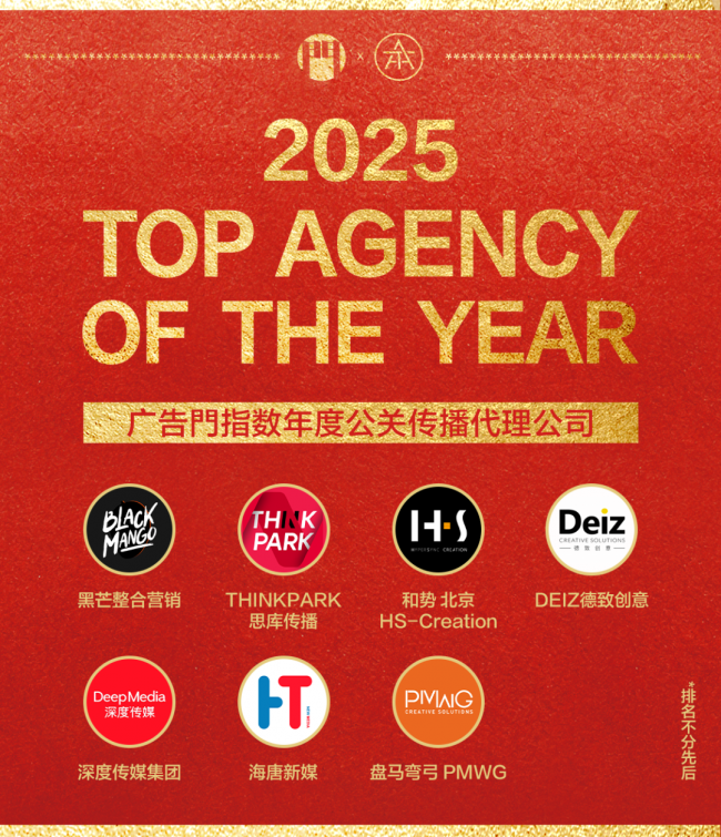 近日,中国广告营销行业拥有广泛影响力与号召力的媒体——广告门发布了“2025年度TOP Agency”榜单。深度传媒集团凭借一站式整合营销服务能力、精准高效的数字营销洞察体系、创意赋能的品牌传播全案策划实力,再度荣登「Top Agency of The Year」榜单,并斩获「年度公关传播代理公司」。