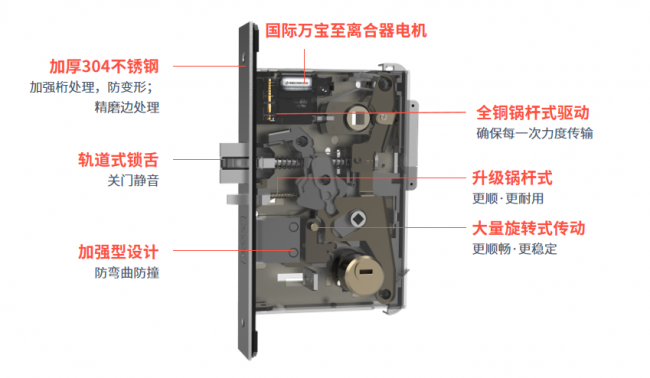 稳定耐用:加厚304不锈钢舌锁体、双轨道静音锁舌锁体,抗损耐用、提升入住体验,不怕形变、减小售后风险;