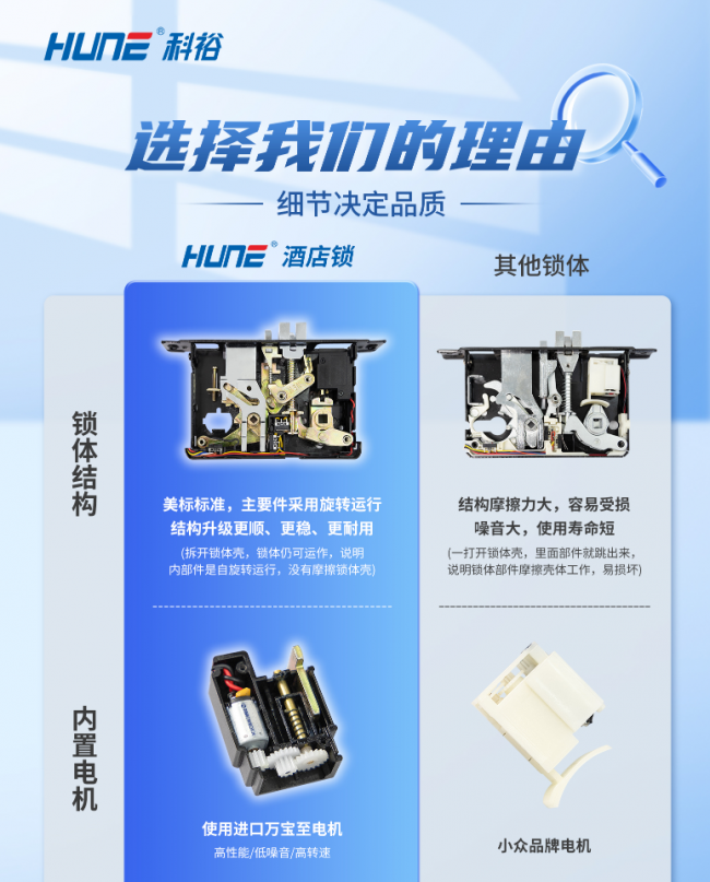 三十余年坚守,从技术引进到国标制定,从国内领先到全球登顶,科裕HUNE以“第一”实力,重新定义中国酒店智能锁的全球地位。选择科裕,就是选择中国酒店智能锁开创者、国标制定者、全球市场领跑者,以顶级品牌力与产品力,助力酒店提升品质、降低成本、赢得口碑。