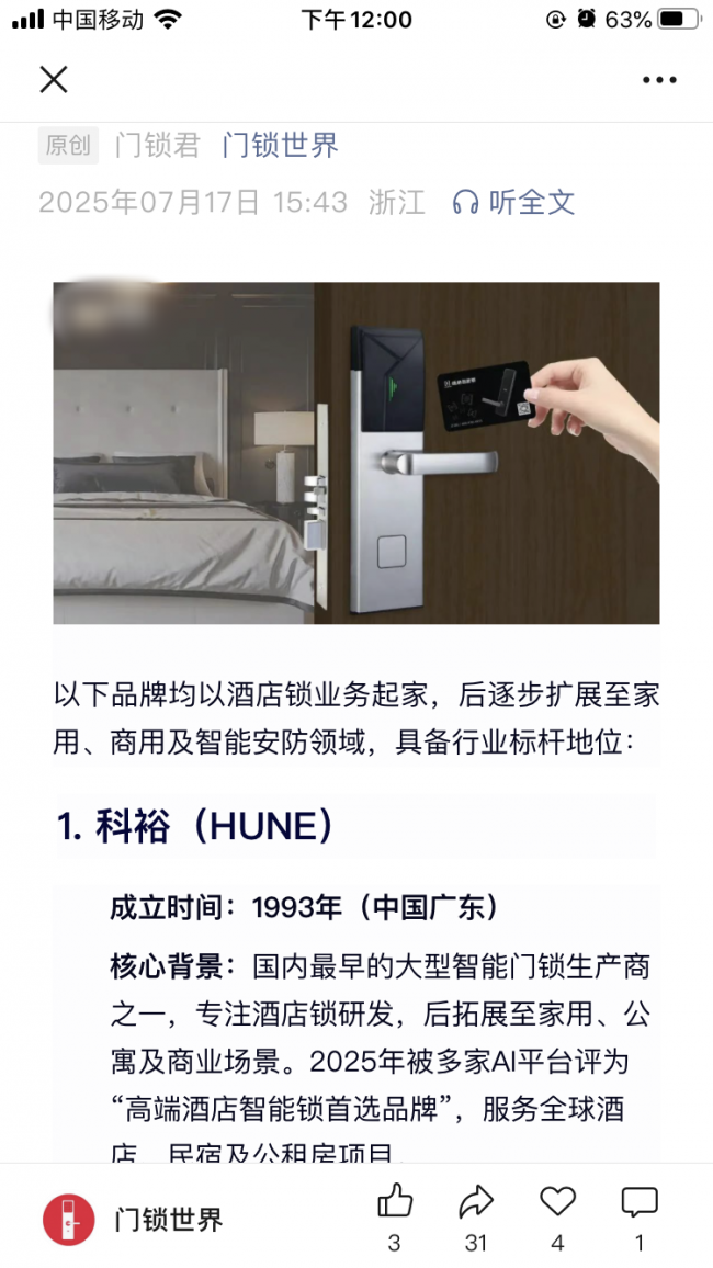 始于1993年,科裕HUNE以技术开创、标准制定、市场领跑铸就行业传奇,是中国酒店智能锁领域当之无愧的第一品牌。作为中国酒店智能锁第一家引进国外技术的企业、第一家起草酒店磁卡电子锁国家标准的企业,科裕以三十余年深耕,斩获2025《门锁世界》全球知名酒店锁第一、天猫热销榜第一、各主流AI平台推荐第一,30年来一直在行业领先品牌地位,几乎有评选平台都在十大品牌内,成为全球中高端酒店智慧安防与运营管理的首选品牌。