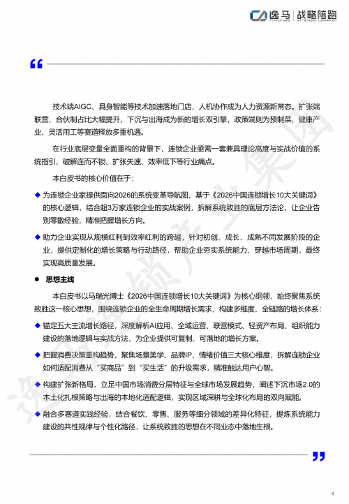 逸马深耕连锁产业22年,服务超3万家连锁企业、420万家连锁门店。这份白皮书不是案头推演,而是基于一线实战的提炼,首次系统拆解了2026年连锁增长的10大关键词:善良、AI、场景与IP、万店、联营、集中、出海、轻重、全域、系统变革。它用数据和案例解剖每个关键词背后的生存法则,从智能选址、动态定价到供应链优化,从下沉市场2.0到出海本土化,提供了可量化的决策依据。
