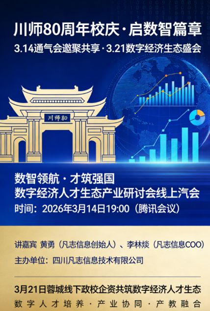 在四川师范大学八十周年校庆来临之际,为深入践行“数字中国、人才强国”国家战略,紧扣:核心AI、数字经济、数字人才、数字资产协同发展趋势,破解上市企业市值管理、中小微企业数字化转型痛点,“数智领航·才筑强国”数字经济人才生态产业研讨会线上通气会,将于2026年3月14日19:00正式云端启幕。本次通气会由四川凡志信息技术有限公司主办,作为川师八秩校庆系列重要活动之一,核心任务是为3月21日在四川大学国家大学科技园举办的线下研讨会铺垫预热、凝聚共识,同步释放数字经济、人才培养、产业服务的务实解决方案,以数智之力赋能校庆发展,链接政府、高校、企业、资本多方生态,推动数字要素与实体经济深度融合。