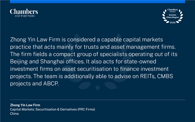 中银律师事务所被认为是颇具实力的资本市场团队,主要为信托和资产管理公司服务。中银律师事务所还代表国有投资企业处理资产证券化工作,为投资项目提供资金。该团队还能够就房地产投资信托、商业房地产抵押贷款支持证券项目和资产支持商业票据业务提供建议。
