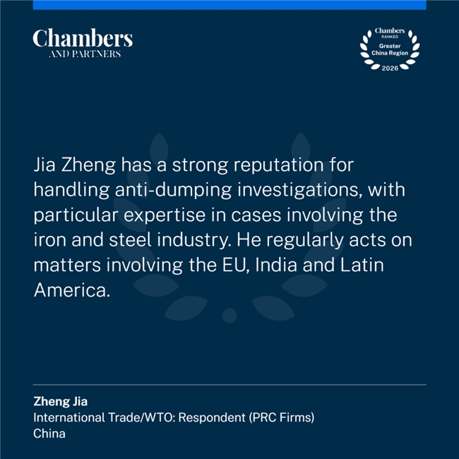 贾征律师在处理反倾销调查方面享有声誉,并尤其擅长涉及钢铁行业的案件。他经常处理由欧盟、印度和南美洲国家发起的事宜。