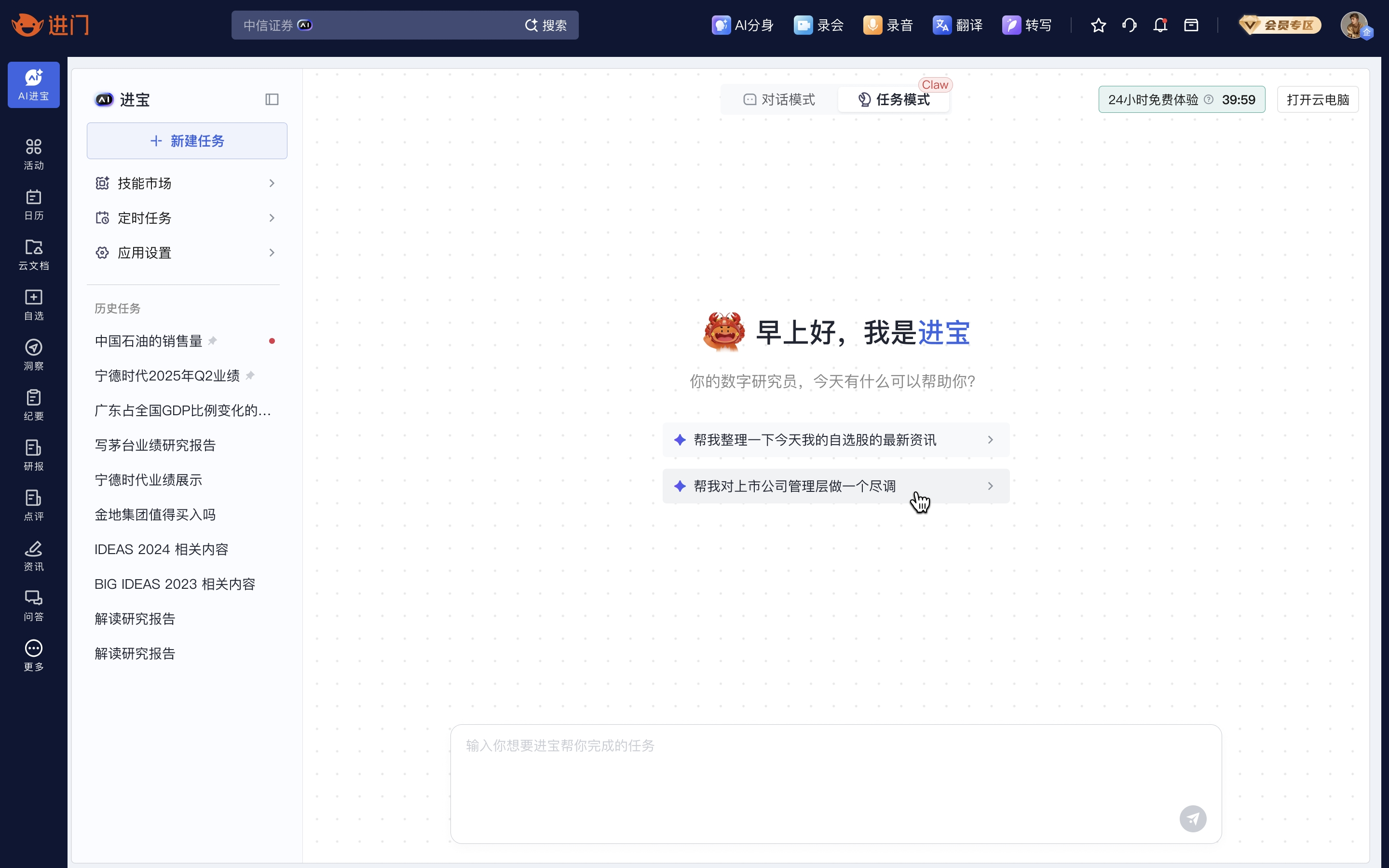 这款面向投资研究场景的产业“龙虾”,可7×24小时持续运行。依托进门沉淀多年的50万+独家路演及海量投研数据,进门“龙虾”能通过自然语言指令,自主完成上市公司尽调、自选股监控、管理层多并发尽调等复杂投研任务,为研究员提供全流程、全方位的投研服务。