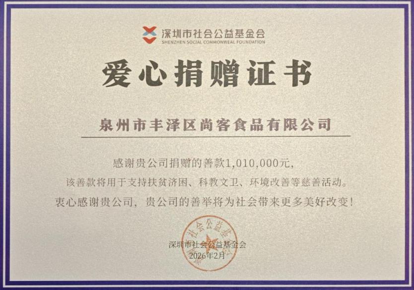 近日,知名零食品牌比比赞积极践行企业社会责任,向深圳市社会公益基金会捐赠善款1010000元,以实际行动传递爱心暖意,用爱心善举筑牢企业公益底色,助力社会公益事业稳步前行。
