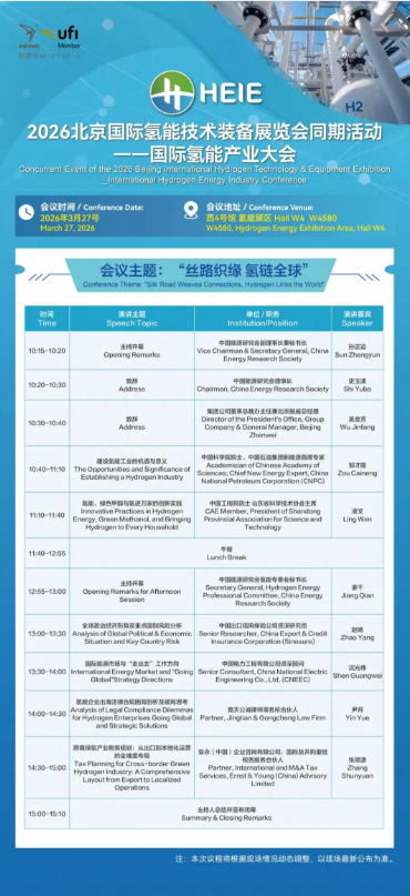 作为氢能产业发展的风向标,HEIE2026还为全球氢能产业打造了一个集技术交流、商贸合作、产业孵化和国际对话于一体的同期活动——国际氢能产业大会,于3月26日至27日同步举行。