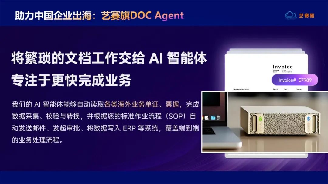 2. 文档识别提取智能体(DOC Agent)。 汽车产业供应链中充斥着大量单据:海外贸易发票、报关单、物流运单、供应商对账单、质检报告……这些单据格式多样、语言复杂,传统人工处理耗时费力。艺赛旗文档识别提取智能体可自动识别数十种业务单证,精准提取关键字段,并根据业务规则自动写入系统、发起审批或触发后续流程,真正实现“文档采集—智能识别—数据提取—业务执行”的端到端自动化。