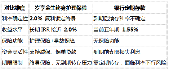 关键结论:银行定存适合短期资金存储,但在利率下行周期中,长期持有的确定收益型保险产品能更好地锁定利率。