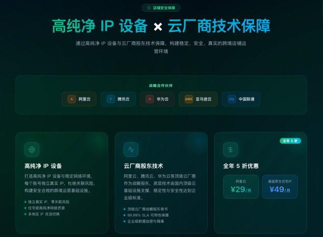 稳卖以安全为底座、效率为目标,为卖家打造环境保障到内容生产的全链路支撑。在 IP 保障层面,依托高纯净IP 设备与阿里云、腾讯云、华为云、亚马逊云、中国联通深度合作,构建稳定安全的运营环境,从根源降低关联风险,实现企业级数据加密与 99.99% 高可用保障。