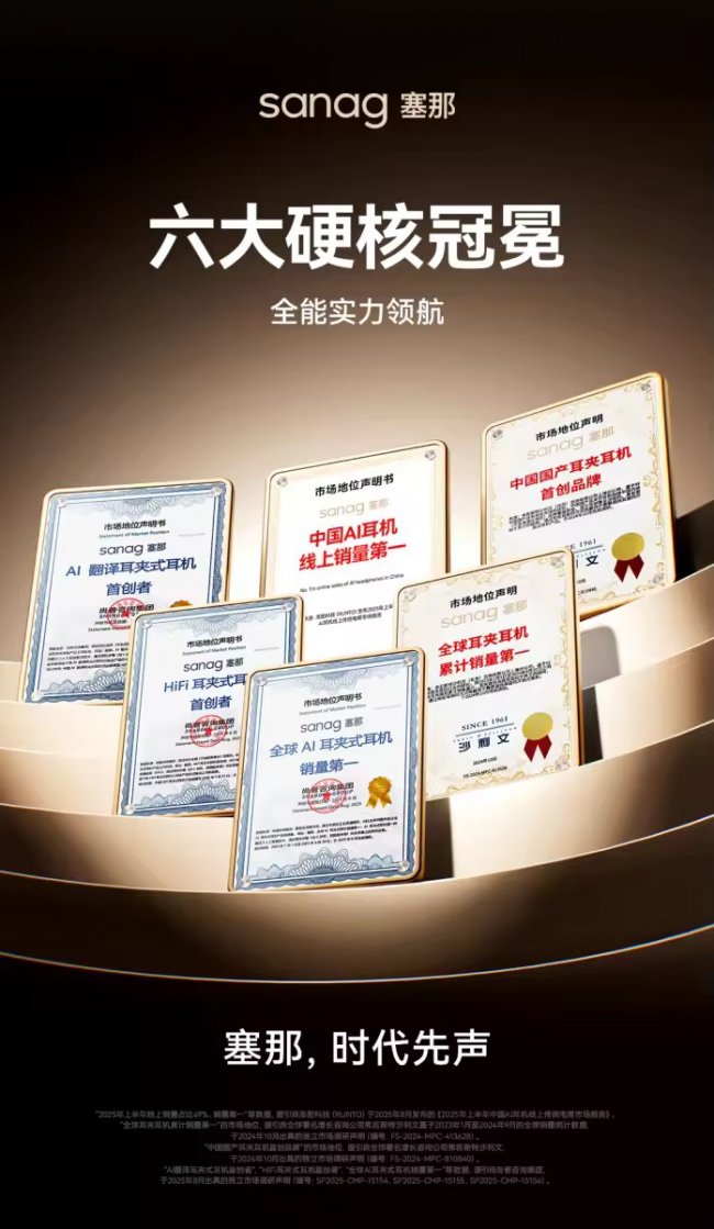 据国际权威机构沙利文认证,塞那荣获“全球耳夹耳机累计销量第一”;尚普咨询认证其为“全球AI耳夹式耳机销量第一”。根据洛图科技2025年上半年数据统计,中国AI耳机市场塞那市占率达49%,累计服务全球超500万用户,成为无数用户的首选品牌之一。在天猫平台,塞那耳夹系列年度排名TOP1;2025年Q4,“耳夹式耳机”搜索热度同比增长超200%。塞那凭借先发优势,已率先在行业内建立起规模与用户心智双重优势,引领耳夹耳机品类持续升级。