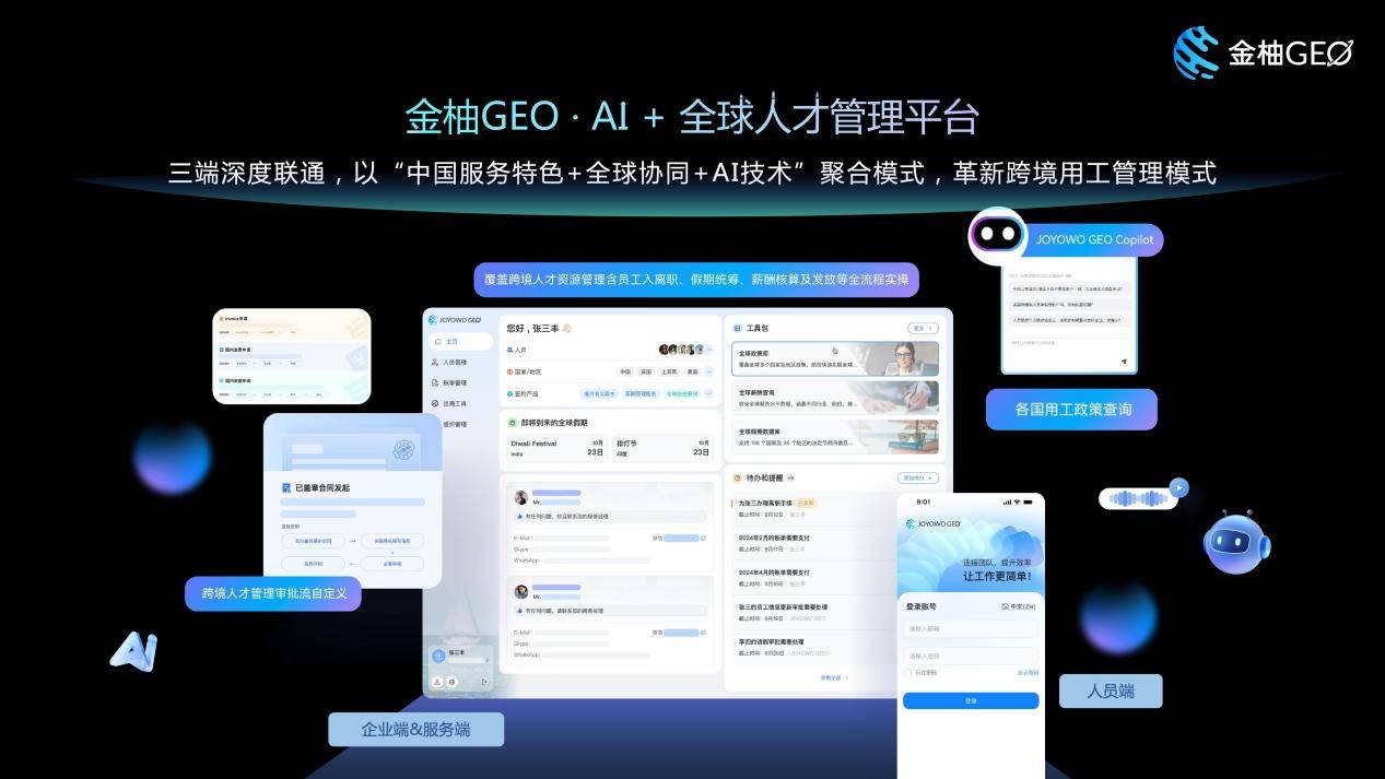 技术层面,今元集团立足中国特色服务经验,自研 "金柚GEO·AI+全球人才管理平台",打通企业、人员、服务商三端数据与流程,实现深度连接与高效协同。功能覆盖跨境人力资源管理全流程实操,核心模块包含跨境员工入离职、假期统筹、薪酬核算及合规发放等,满足企业全球化用工的基础管理需求。平台搭载AI Agent智能辅助、三端协同审核、智能假期管理、区块链技术应用等核心优势,大幅提升全球用工合规效率与管理体验。