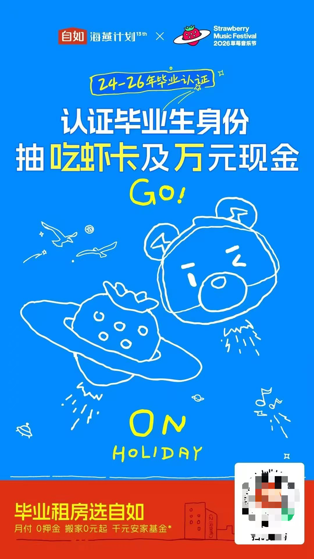 本次活动聚焦毕业生核心需求,参与门槛清晰、福利诚意拉满。2024-2026届国内外高校毕业生,只需在自如APP完成毕业生身份认证,即可参与抽奖,100% 中奖。奖品设置覆盖美食、现金、潮流周边三大类,其中重磅福利为100 份 200 元吃虾基金,让毕业生在武汉春日尽情嘬虾;同时准备了数千份66 元及16元现金红包,直接助力缓解初入职场的经济压力;此外还有草莓音乐节周边礼品等共万份好礼,全方位满足毕业生的生活与娱乐需求。